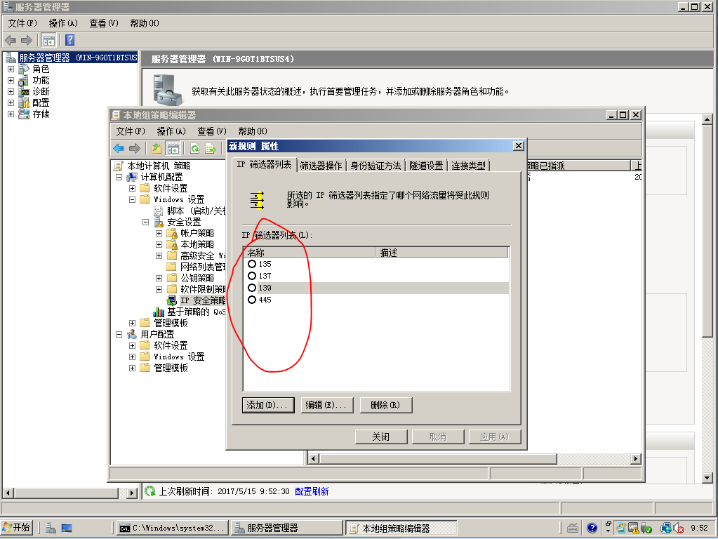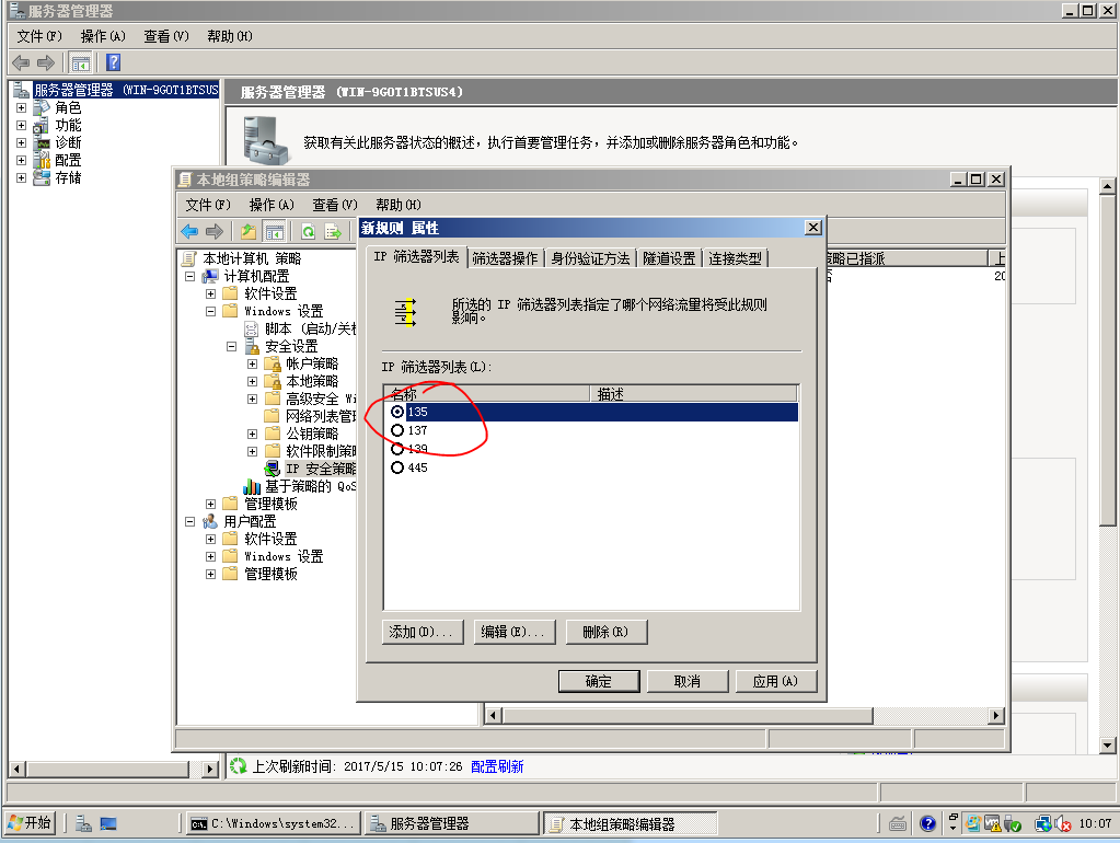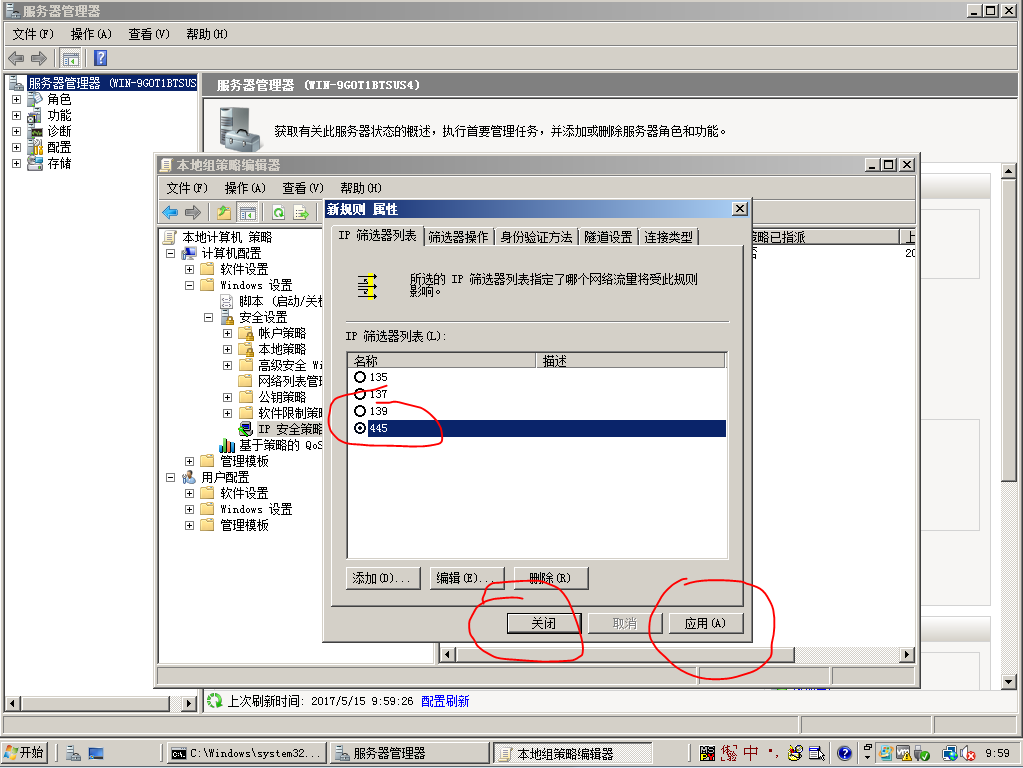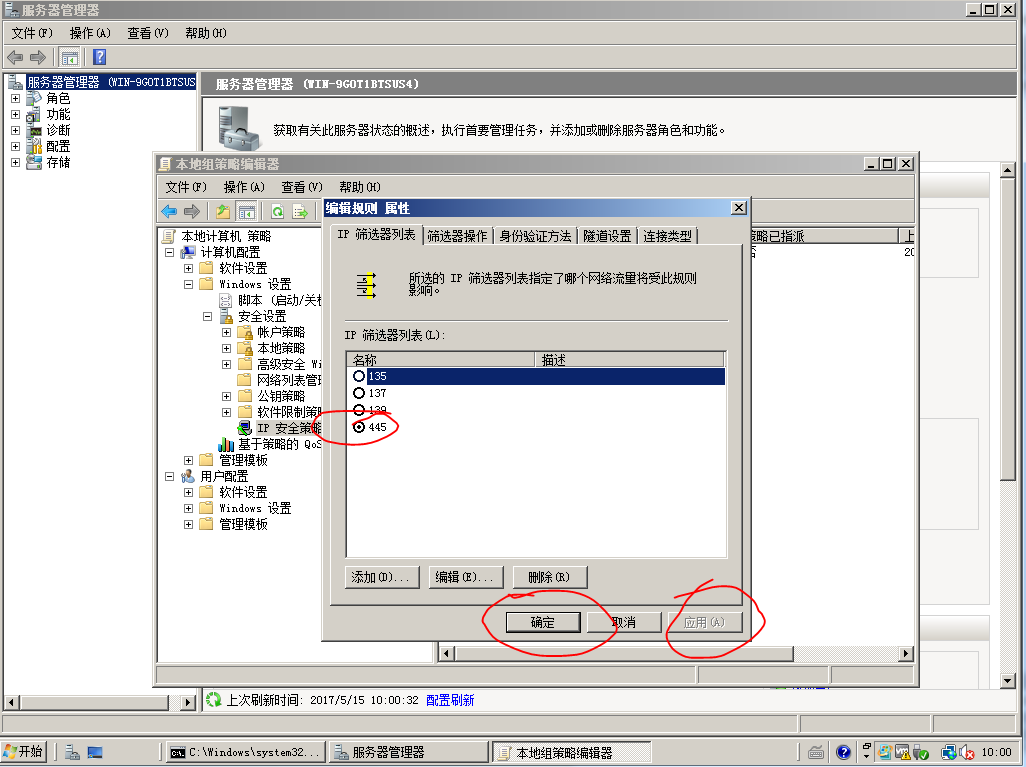 切换到IP筛选器列表,勾选刚才建立的“445”。单击“应用”,然后单击“确定”。