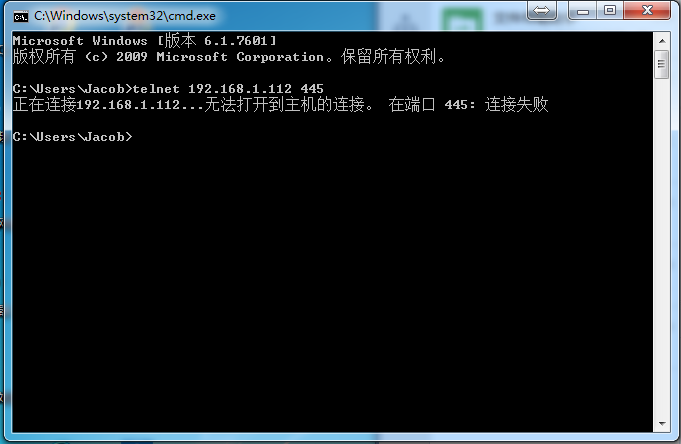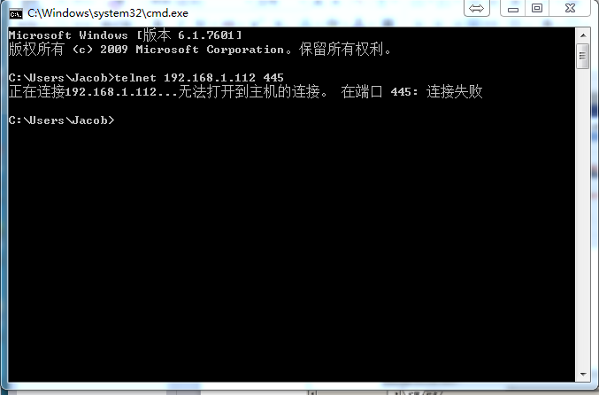 在IP安全策略处于分配状态下,通过telnet测试,无法连接该端口。