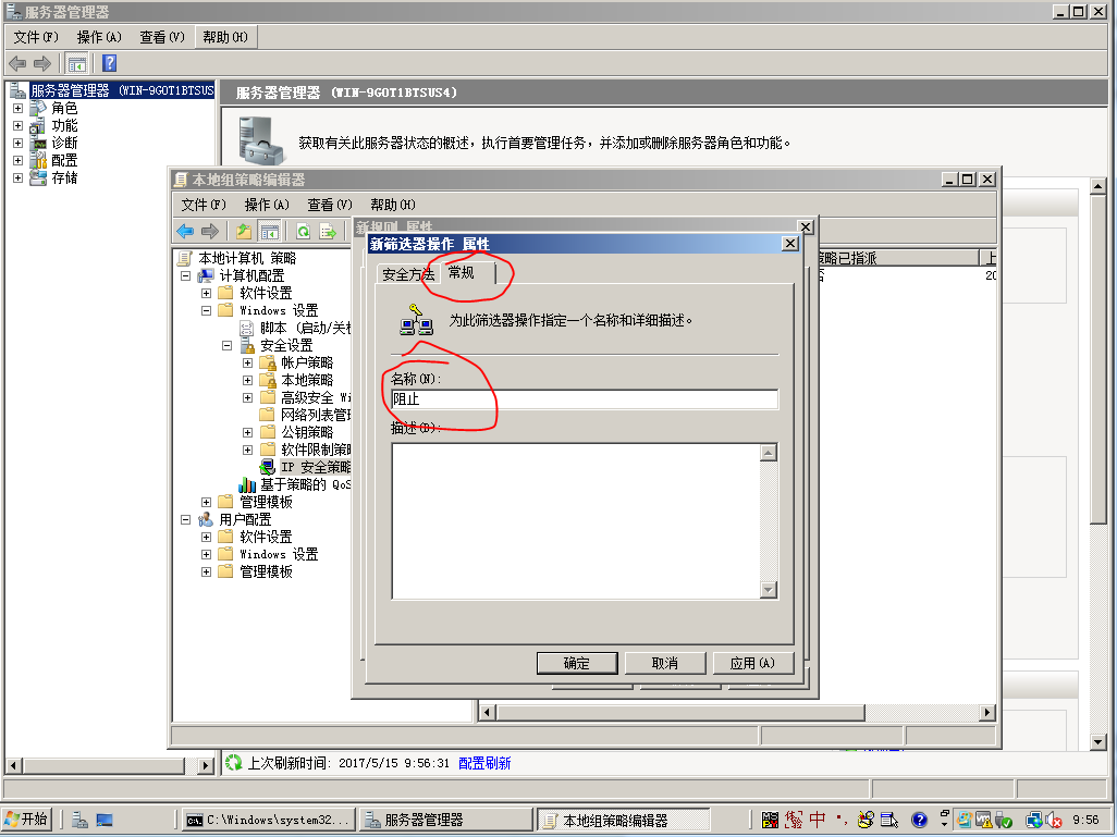 在新筛选器操作属性中,选择“阻止”,并切换到常规选项卡,将名称改为阻止。