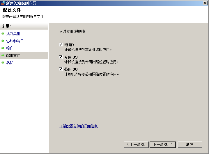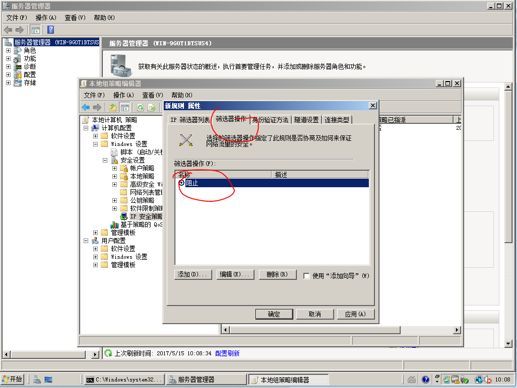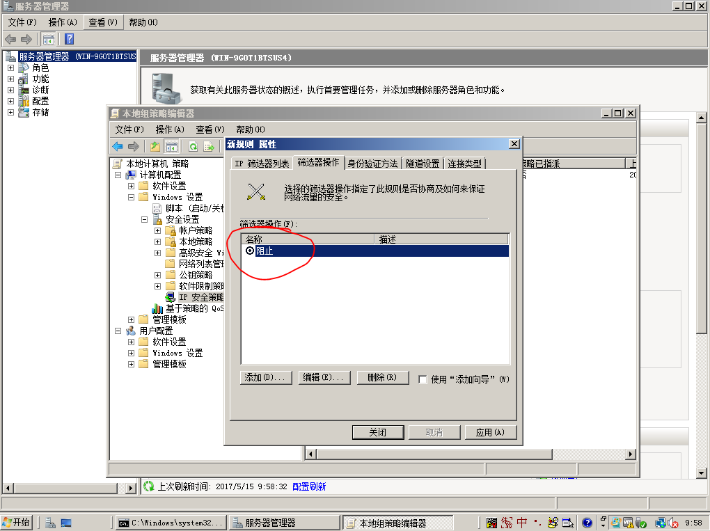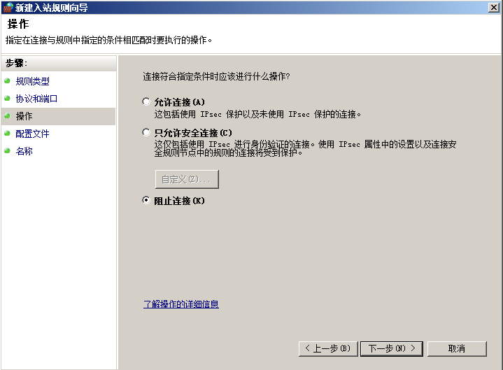 单击确定,回到新规则属性窗口中的筛选器操作,勾选刚才建立的“阻止”。