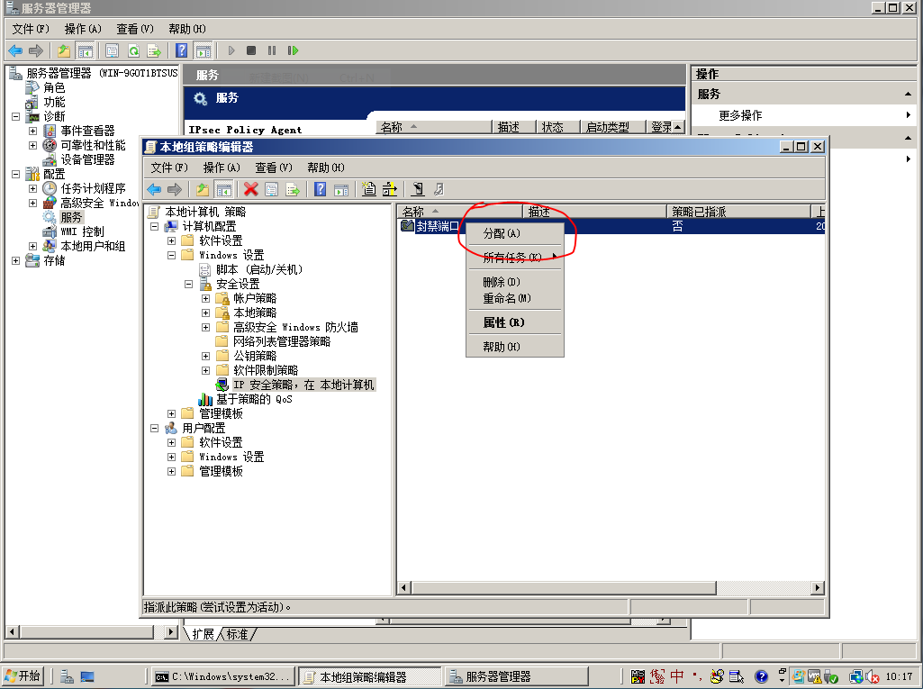 右键单击右侧刚才创建的“封禁端口”,在右键菜单当中选择分配,就成功关闭了端口。