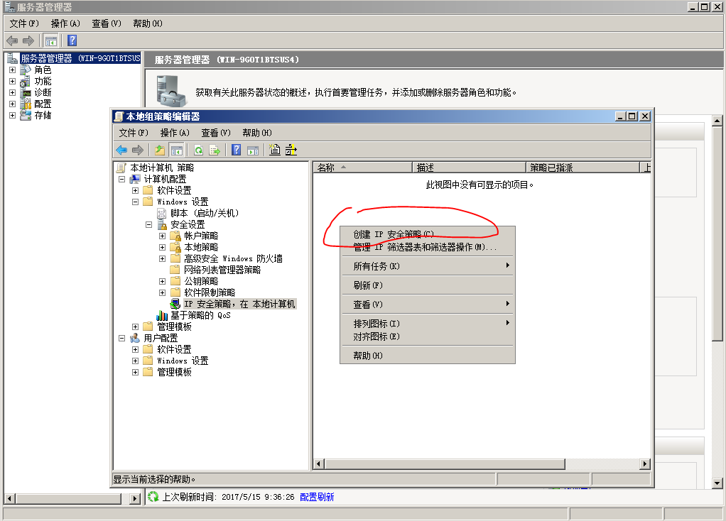 接下来右键单击 “IP安全策略,在 本地计算机”,并选择“创建IP安全策略”
