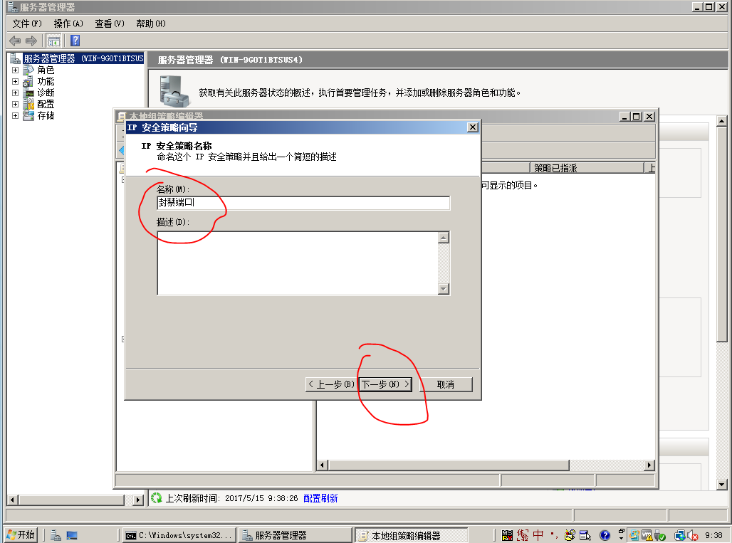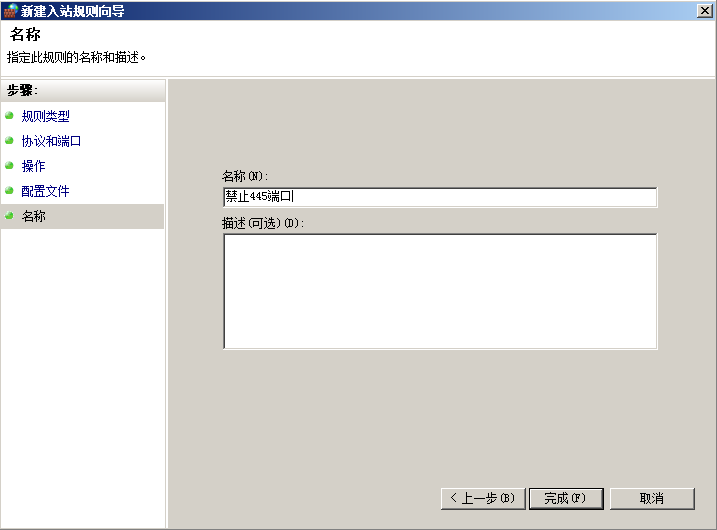 在第二步的名称中输入“封禁端口”然后一路“下一步”。