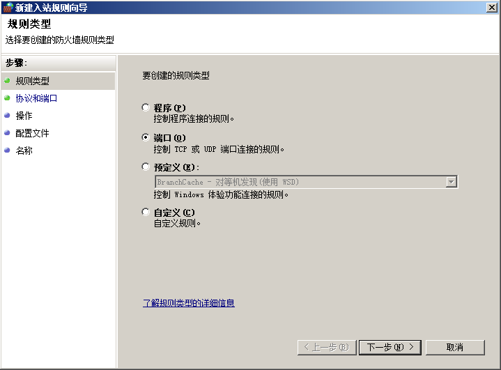 然后在这里选择协议和端口,如果要禁用UDP则需要重新操作一遍。如下图:
