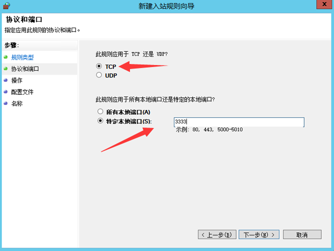 4. 选择“新建规则”在弹出的列表中建立需要开放远程连接端口号(以3333为例),开放端口的具体操作步骤如下图所示: