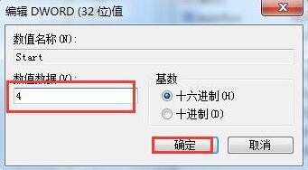 3、在编辑DWORD(32位)值窗口中,将数值数据改为4,点击确定,如图所示: