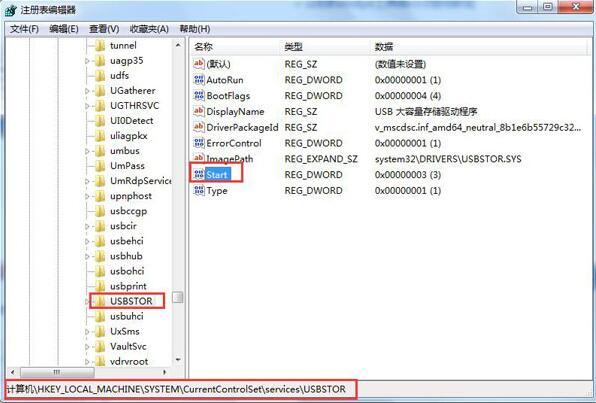 2、在打开的注册表编辑器中,依次展开HKEY_LOCAL_MACHINE\SYSTEM\CurrentControlSet\services\USBSTOR,在右侧找到start项并双击,如图所示: