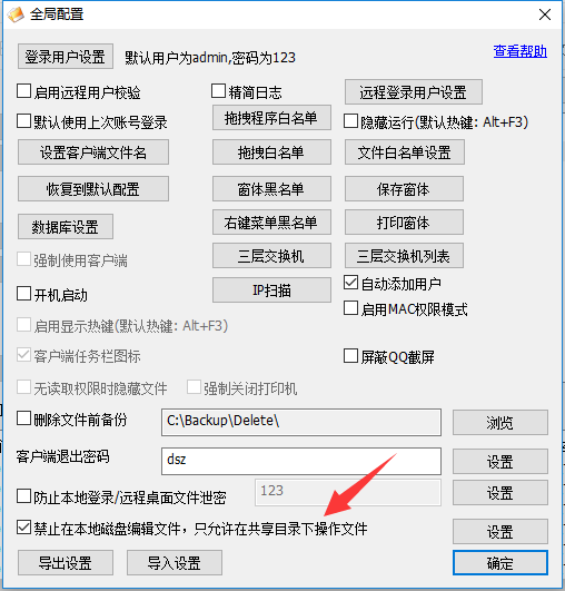 点开“大势至局域网共享文件管理系统”的“全局设置”,然后勾选“禁止本地磁盘编辑文件,只允许在共享目录下操作文件”的功能,这样用户本地无论是创建文件、打开文件都会直接被关闭,而用户打开服务器共享文件夹,或者打开服务器上共享文件就可以正常打开、编辑、修改等操作。这样可以实现了随时随地保存员工日常的工作文件的功能,可以较大限度保护公司商业机密的安全。如下图:
