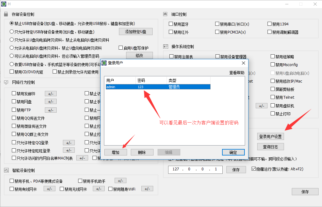 然后在策略里面,我们可以点击右下角的“登录用户设置”,这里可以为客户端修改密码。比如,你可以直接双击“admin”账号,然后重新设置密码;也可以删除admin账号,重新创建一个新的账号和密码。同时,如果之前曾经为客户端设置过密码,则这里可以直接看到较后一次的密码。如下图: