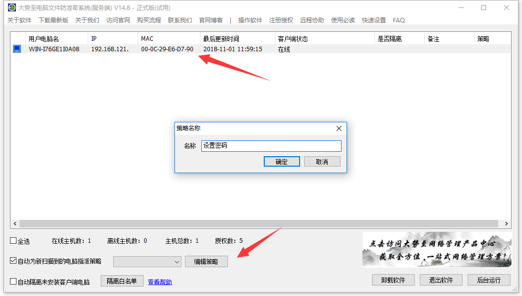 如果是在使用大势至电脑文件防泄密系统网络版的情况下,则可以通过网络版的管理端为客户端统一设置密码。方法如下: