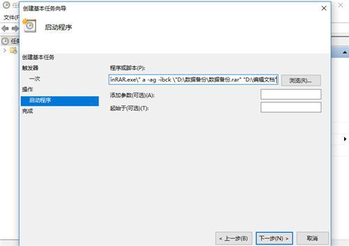 7.在“启动程序”面板中输入程序脚本"C:\Program Files\WinRAR\WinRAR.exe\" a -ag -ibck " D:\数据备份\数据备份.rar" "D:\编辑文档",然后进入下一步。