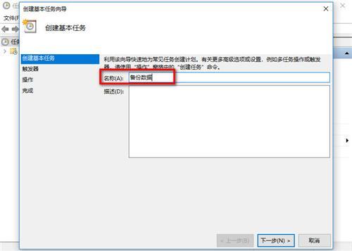 4.进入到“创建基本任务向导”,在项的“创建基本任务”面板中为任务计划起名,例如为这个任务起名为“数据备份”,完成后进入下一步。