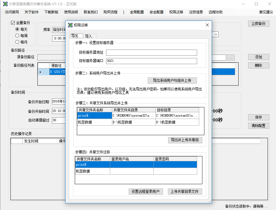 此外,大势至服务器文件备份系统还特别集成了“权限迁移”的功能,也就是可以将服务器现有的文件及其用户访问权限导出备份,然后迁移到新的服务器上,从而避免了用户设置服务器文件和用户对应访问权限的麻烦。如下图: