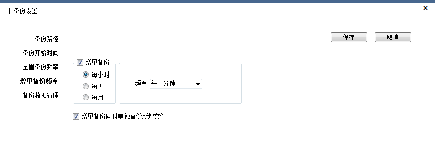 设置增量备份频率。“增量备份”是指在一次“全量备份”后或上一次增量备份后,以后每次的备份只需备份与前一次相比增加或者被修改的文件。本系统可以按照小时、天、月来设置备份频率,同时可选择“增量备份同时单独备份新增文件”,这样就会将新增文件本分至一个单独的文件夹内。如下图: