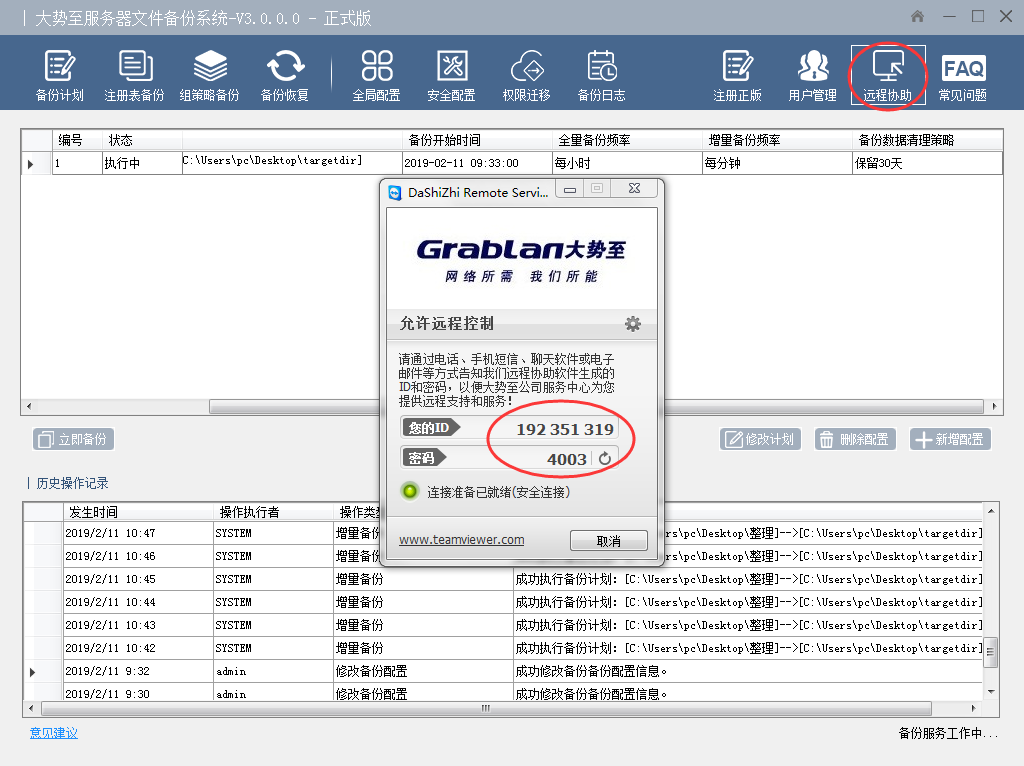 在软件服务期限内,可以通过电话、邮件、即时通讯软件等方式享受大势至公司技术支持服务。同时,还可以点击软件界面顶部的“远程协助”(会弹出小软件,自动生成ID和密码,告知我公司即可)为您提供实时的“人工现场”技术服务,帮助您进行软件设置、演示、解决各种问题等。