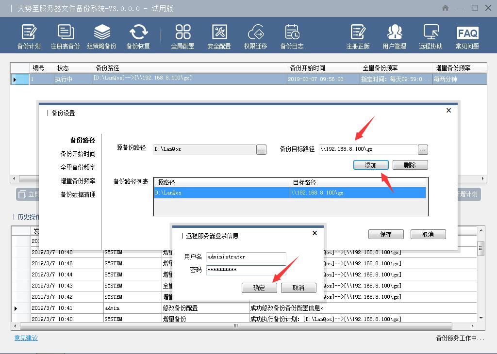 注意:如果备份的目标服务器是网络路径,则需要输入账户和密码,同时也需要手动输入网络路径的IP地址和备份的目标文件夹,如下图: