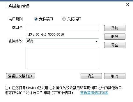 *注意:由于此功能基于Windows防火墙机制实现,因此端口放开或关闭的前提是必须打开Windows防火墙,否则一旦关闭Windows防火墙则所有端口就默认放行了。