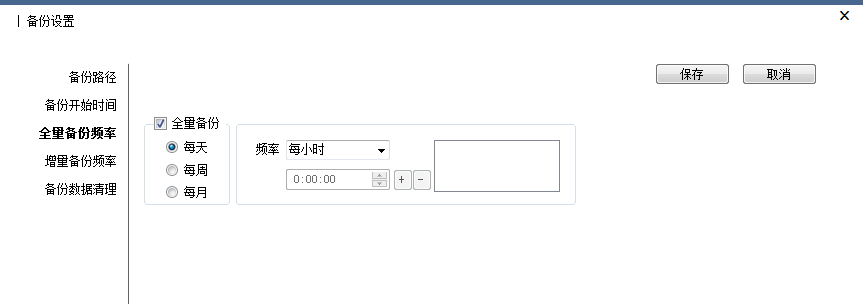 设置全量备份频率。“全量备份”是指对某一个时间点上的所有数据或应用进行的一个完全拷贝。实际应用中,通常是指服务器中某个磁盘或者某个文件夹下面的所有文件和数据进行备份。这种备份方式相当于模拟人工将磁盘文件完全复制到另外的存储空间(磁盘的其他分区、外接移动硬盘、其他服务器、NAS存储阵列或者私有云等)。这种备份方式可以对全部数据进行保护,一旦源文件丢失可以进行全部还原。但由于“全量备份”每次都是备份全部数据,因此会占用较大的磁盘存储空间。在本系统中可按天、周、月设置备份频率,如下图: