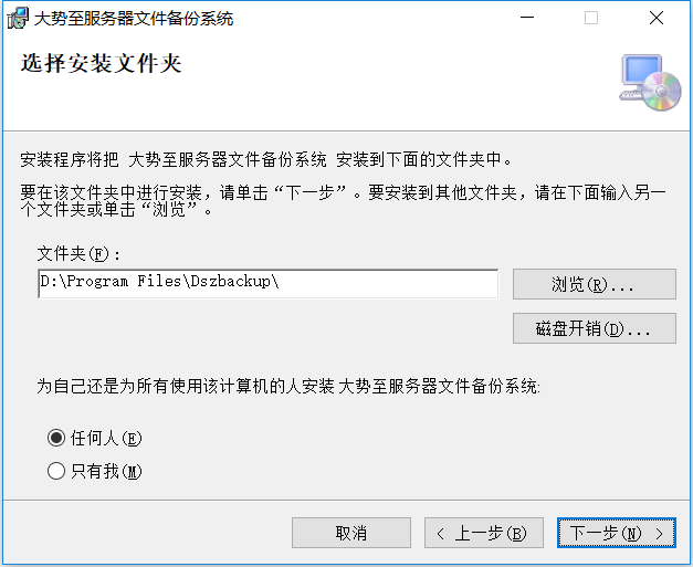 选择软件安装路径,默认为D:\Program Files\Dszbackup,可以更改到其他安装路径。如下图: