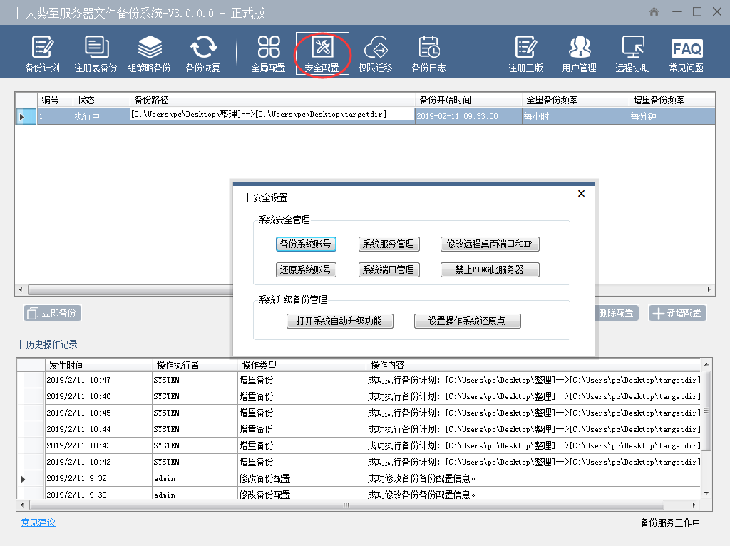 这里可设置软件开机自启动,“备份文件变更记录”,此功能会记录备份源文件夹内文件变动情况,便于管理员查询;“修复底层服务”,本功能是自动卸载本系统之前的底层服务,然后自动重新安装服务,便于系统正常工作。