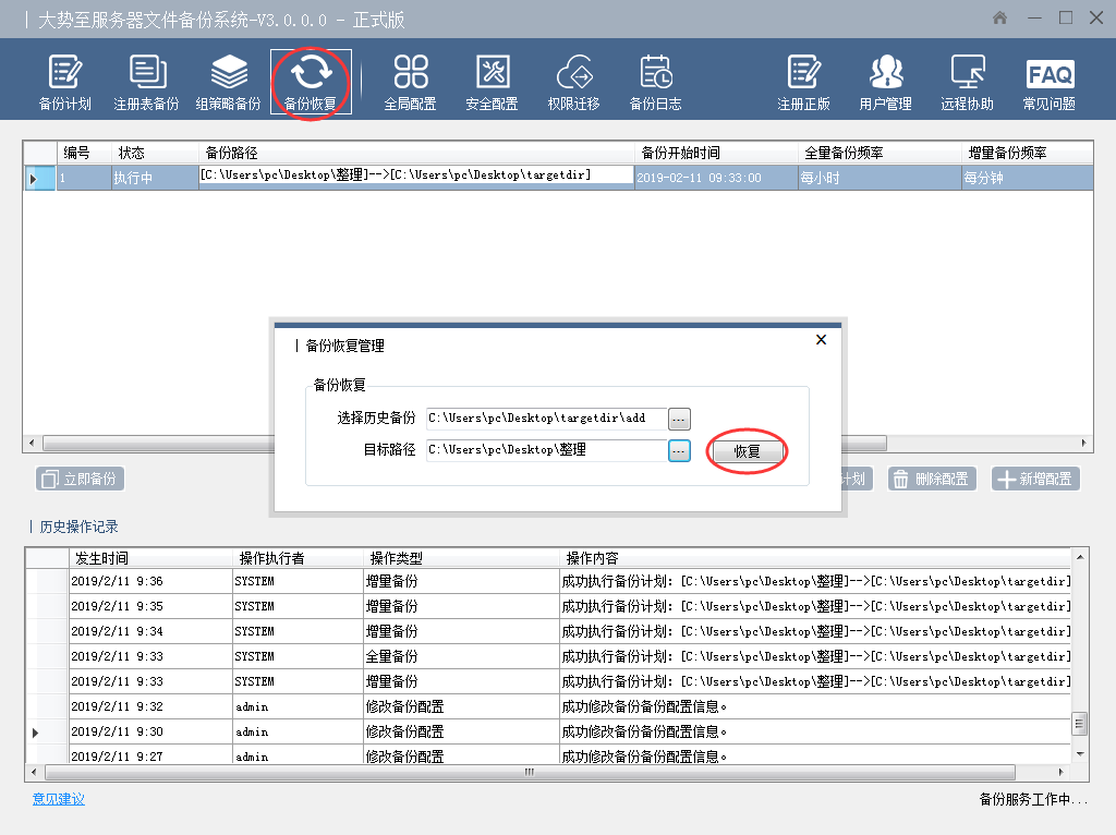 “备份恢复”,是指一旦源文件出现问题后,可以在这里选择以前的“全量备份”和“增量备份”进行恢复。
