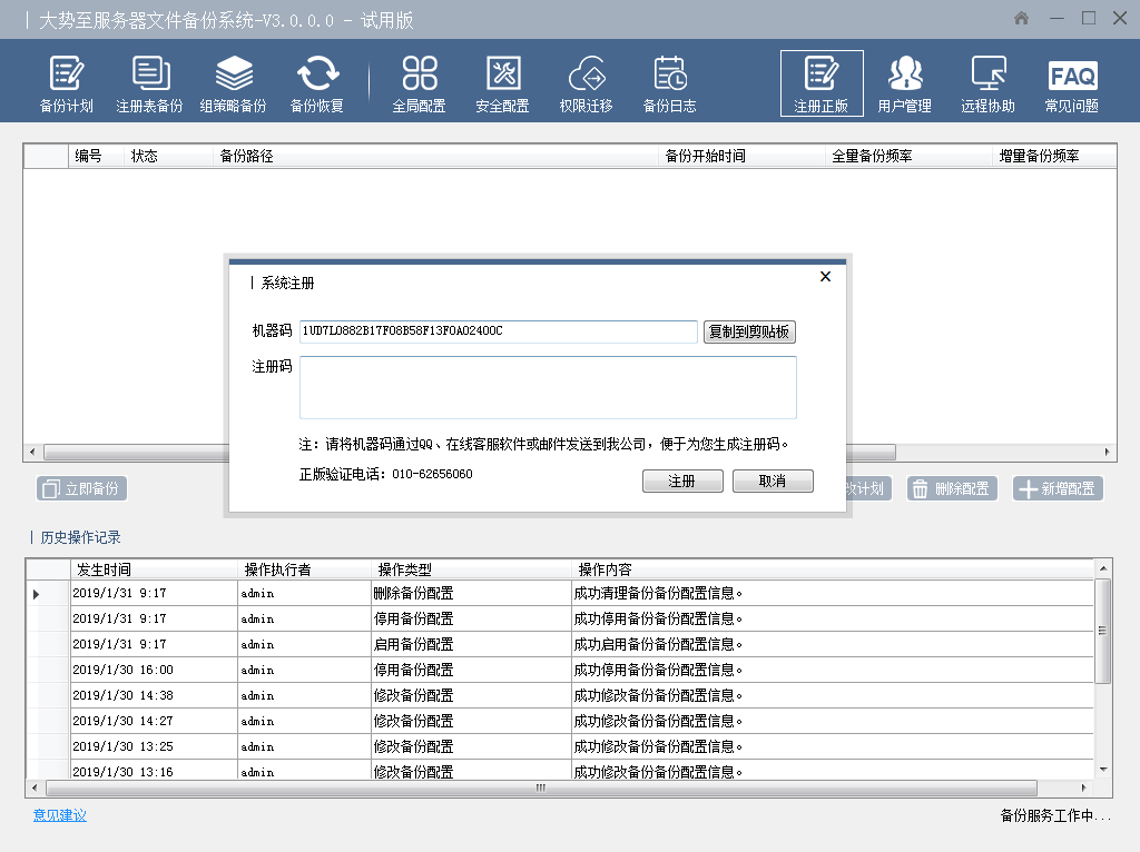 点击软件顶部“注册正版”,复制机器码发送到大势至公司,然后将收到注册码填写至注册码框内,点击“注册”即可。如下图: