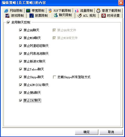 在企业的网络环境中,网络聊天是非常普遍的现象,很多公司职员一上班就打开各种聊天软件,如QQ、MSN等等进行网络聊天。从实际的情况来看,各种聊天工具真正用于工作上的少之又少,绝大多数都是聊与工作无关的私事。针对这种情况,聚生网管集成了当前较流行的12种聊天工具,如:QQ,MSN,网易泡泡,新浪UC,QQ传文件,MSN传文件,AIM(ICQ),Skype网络电话,SoQ搜Q,阿里旺旺,雅虎通Yahoo,IRC等等,是国内限制聊天工具较多、较有效的网管软件。值得说明的是,聚生网管控制聊天工具尤其是国内其他网管软件难以封堵的QQ、skype等等,也只需要点点鼠标就可以控制,远远于国内类似的控制软件。同时,聚生网管系统还针对企业信息安全的需要,增加了控制msn、qq等传输文件限制的功能,从而避免了企业雇员通过QQ、MSN的文件传输功能将企业的商业机密盗取的可能性。如图2: