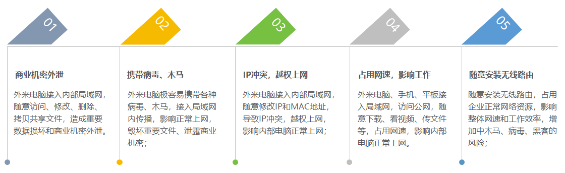 随着网络技术的快速发展与广泛应用,如何保护局域网安全,防止外来电脑、手机、平板、无线路由等私自接入内网引发的各种安全风险,成为摆在我们面前较重要的课题,具体体现在以下几个方面: