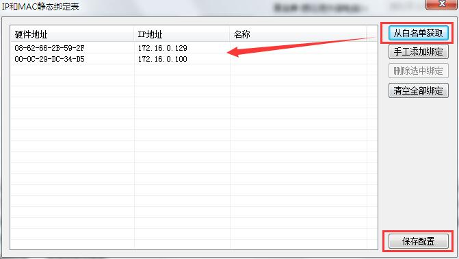 勾选“静态绑定IP和MAC”并点击“管理”,弹出“IP和MAC静态绑定表”,如果点击“从白名单获取”,则系统自动获取当前白名单电脑的IP和MAC地址,也可点击“手工添加绑定”并自行输入要绑定的IP地址和MAC地址,后点击“保存配置”即可。