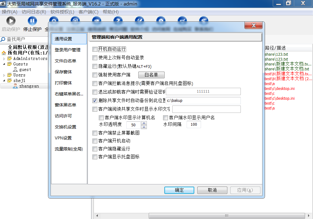 大势至共享文件管理系统是国内专门设置共享文件访问权限、防止共享文件随意复制、修改、删除、下载、另存为本地的专门软件,通过在服务器上安装部署之后,就可以有效控制局域网用户访问共享文件的行为。并且,可以实现只让打开共享文件而禁止另存为本地磁盘、只让修改共享文件而禁止删除共享文件、只让读取共享文件而禁止复制共享文件等,有效保护了共享文件的安全,而且还可以详细记录共享文件访问日志,便于事后备查和审计。大势至局域网共享文件管理系统的详细截图如下: